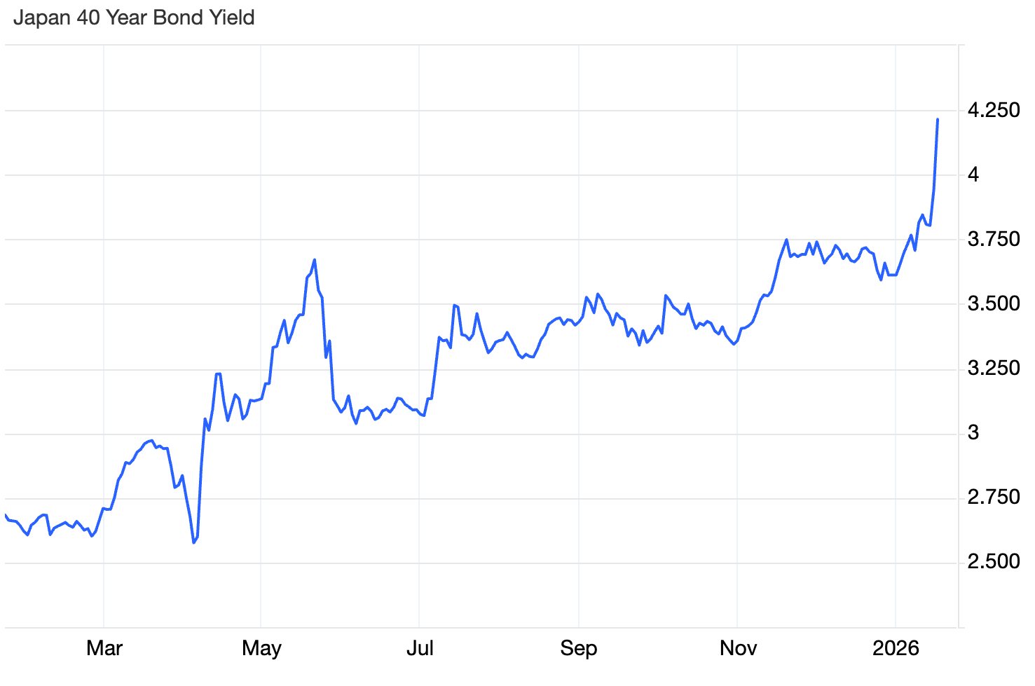 On Tuesday, long-term Japanese government bond (JGB) yields spiked, with the 40-year yield briefly surging past 4%—a record since the maturity’s introduction in 2007 and the highest for any Japanese sovereign tenor in more than three decades. The move prompted questions about whether markets are beginning to demand a higher risk premium for Japan’s fiscal trajectory.